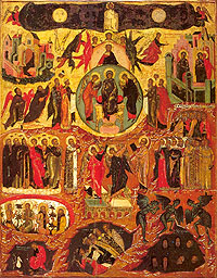 Ярославская иконописная школа – художественное явление русского искусства второй половине XVI - XVII вв. Она сложилась и развивалась в заключительный период истории древнерусского искусства, поэтому во многом подвела итог семивековому развитию русской иконописи. Школа сложилась на основе местной художественной традиции, существовавшей в Ярославле в XIII – XV веках. Влияния московского искусства, мастера которого активно работали в Ярославле в первой половине XVI века, были творчески переработаны ярославскими иконописцами. Важной особенностью ярославской иконописной школы является активная роль посада (горожан) в формировании, как содержания, так и стиля ярославской иконописи. Со второй половины XVI века важная роль Ярославля во внутренней и внешней торговле способствовали экономическому и культурному подъему города, где преобладало ремесленное и торгово-промышленное сословие. В это время в растущих ремесленных посадах и слободах строятся многочисленные деревянные приходские церкви, которые после пожара Ярославля в 1658 году будут заменены на каменные. Для этих храмов писали иконы, часть из которых дошла до нашего времени. От XVI века сохранилось 80 икон (от предыдущего периода 17). Иконопись Ярославля этого времени имеет два стилистических направления. Одно из них ориентируется на московское искусство конца XV – начала XVI веков. К нему относятся, в частности, иконы «Федор, Давид и Константин в житии» (ЯИАМЗ) и «Варлаам Хутынский в житии» (ЯХМ). Этому направлению свойственны простые незагруженные композиции, тонкий мастерский рисунок удлиненных фигур, мягкий колорит. К концу XVI века этот стиль исчерпает себя. Другая стилистическая группа икон характеризует местные художественные вкусы. Образцом этой группы являются иконы «Благовещение со служанкой» (ЯХМ), иконы пророческого чина (ЯХМ). Насыщенность композиции, упрощенный рисунок, темноватый колорит соседствуют в них с эмоциональностью и непосредственностью персонажей. Эти иконы были написаны, видимо, художниками из посадской среды, которые внесли в традиционные образы свежее мировосприятие. События Смутного времени отразились в иконах начале XVII века. В иконах «Воскресение - Сошествие во ад» (ЯИАМЗ) и «Единородный сын» (ЯХМ) грозно звучит тема возмездия. В начале XVII века город Ярославль был крупным иконописным центром. Несмотря на разорение города, ярославские иконописцы не только пишут иконы для местных храмов, но и выполняют крупные заказы из других городов. В церкви Николы Надеина в 1640 году работали лучшие костромские и ярославские мастера. Среди них был ярославец Стефан Ефимьев Дьяконов, который участвовал в росписи Успенского собора Московского Кремля, а потом был зачислен в жалованные царские мастера. В церкви Ильи Пророка в 1650 году писали иконы государевы мастера Истома Савин и его сын Назарий Истомин, работавшие для купцов Строгановых, костромич Иван Гущин. Ярославцу Стефану Духовскому приписывается икона «Спас с припадающими» из местного ряда иконостаса. Основную же часть икон из Ильинского иконостаса выполнили ярославские городовые мастера. К строительству и оформлению приходских храмов заказчики привлекали лучшие художественные силы в стране. Это способствовало формированию здесь высокопрофессиональной художественной среды, уважения к мастерству, живо